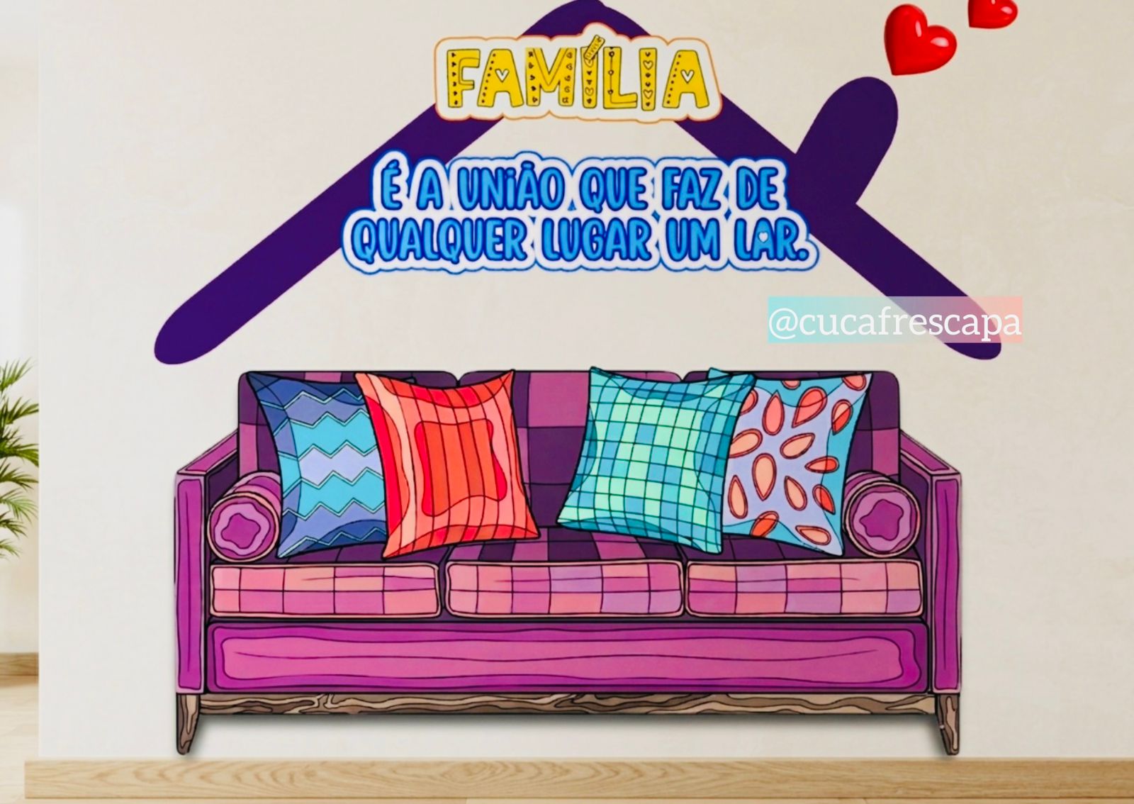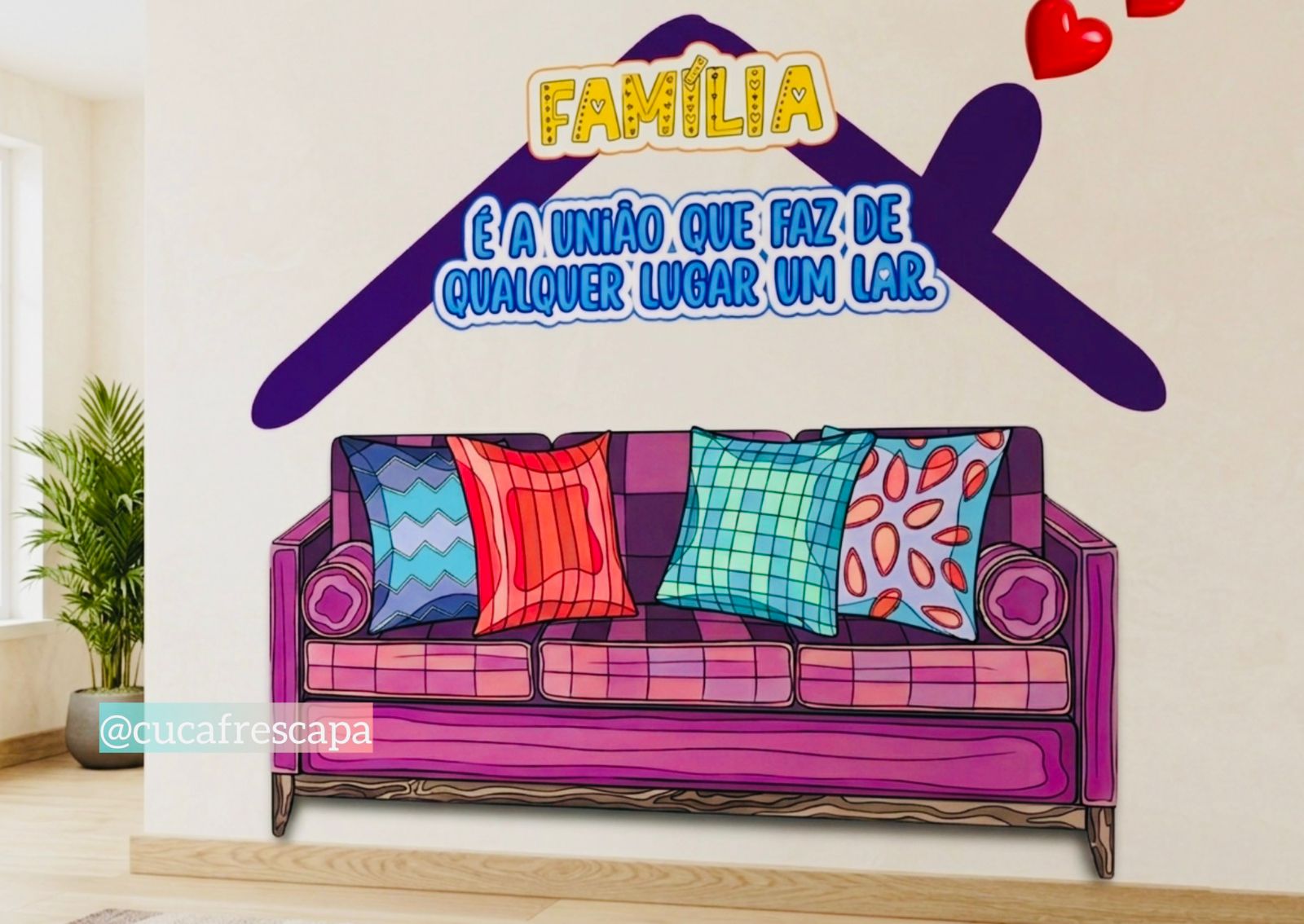 Nesse lindo painel você encontra um cenário que simula um sofá e um telhado de uma casa.