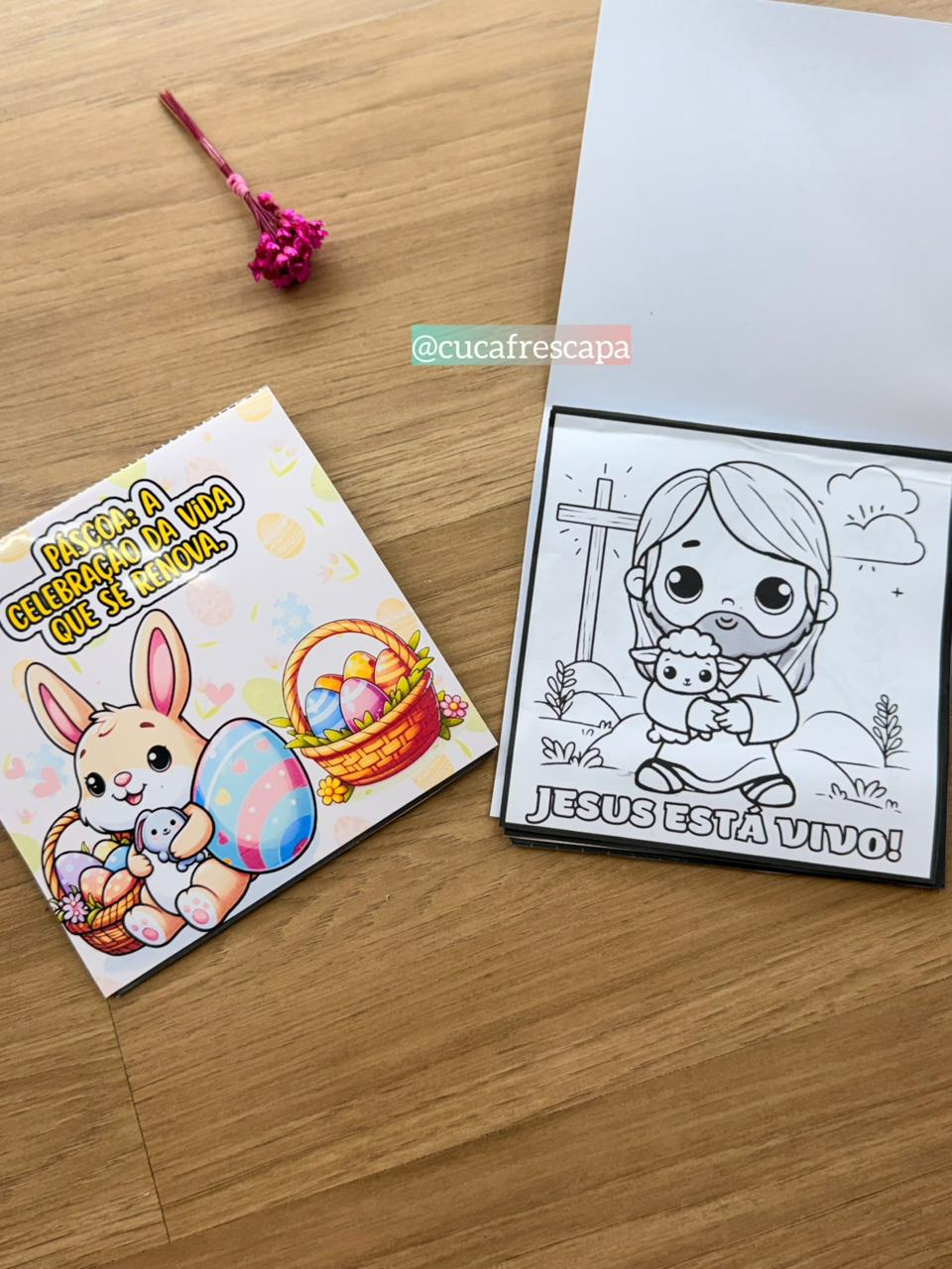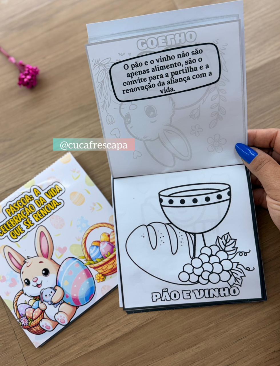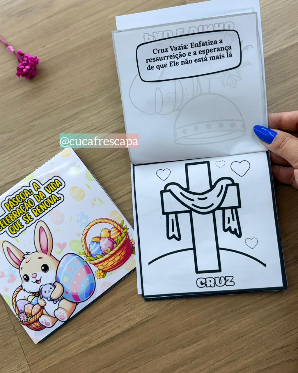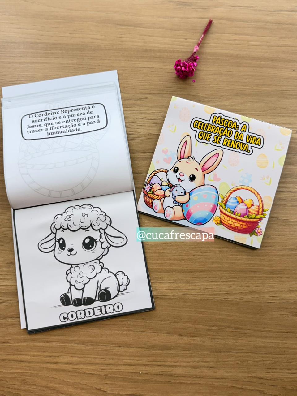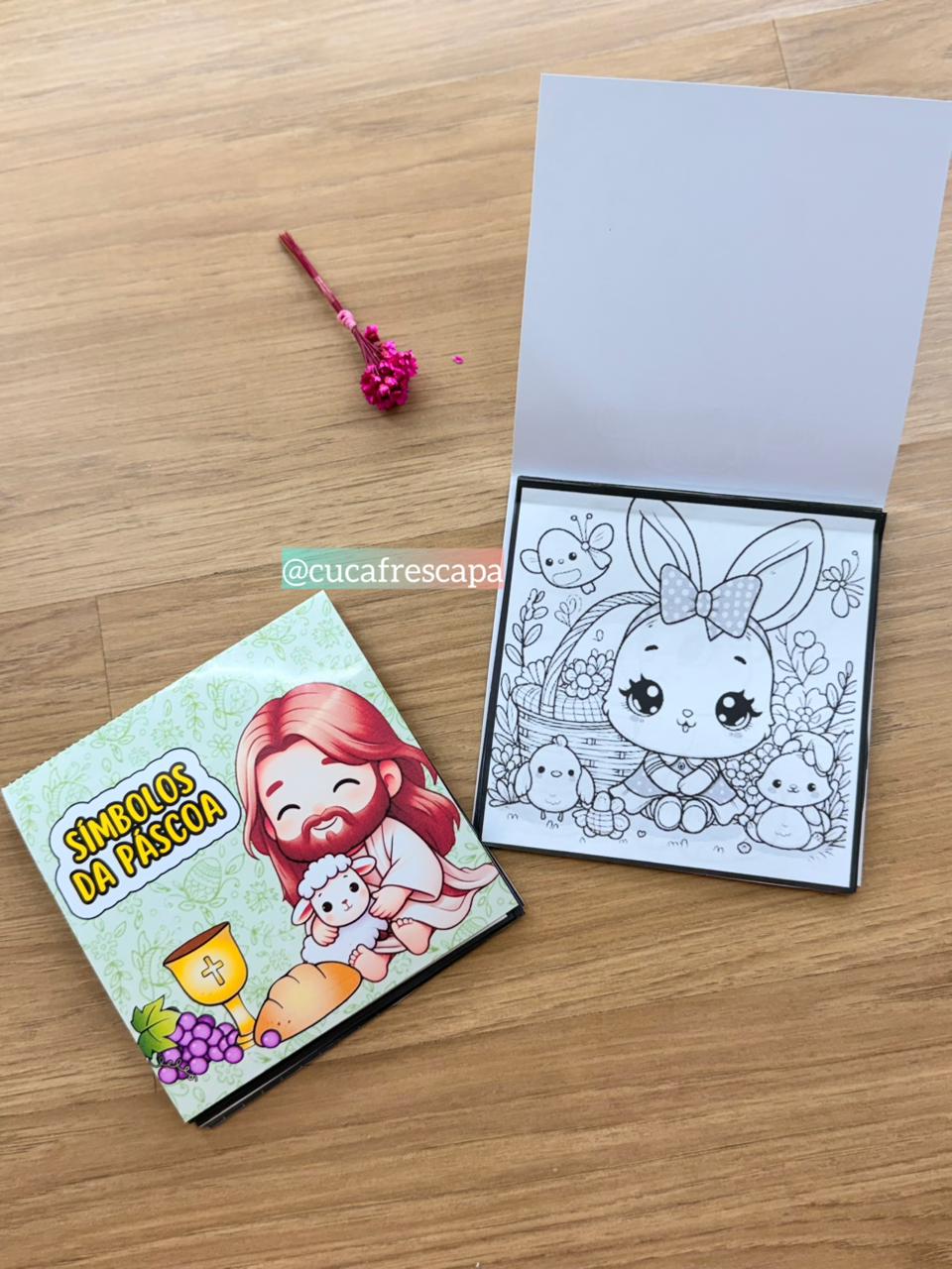 Nesse arquivo você encontra dois livros para colorir, um livro com os símbolos da Páscoa e seus significados e outro com imagens de coelhinhos fofos.